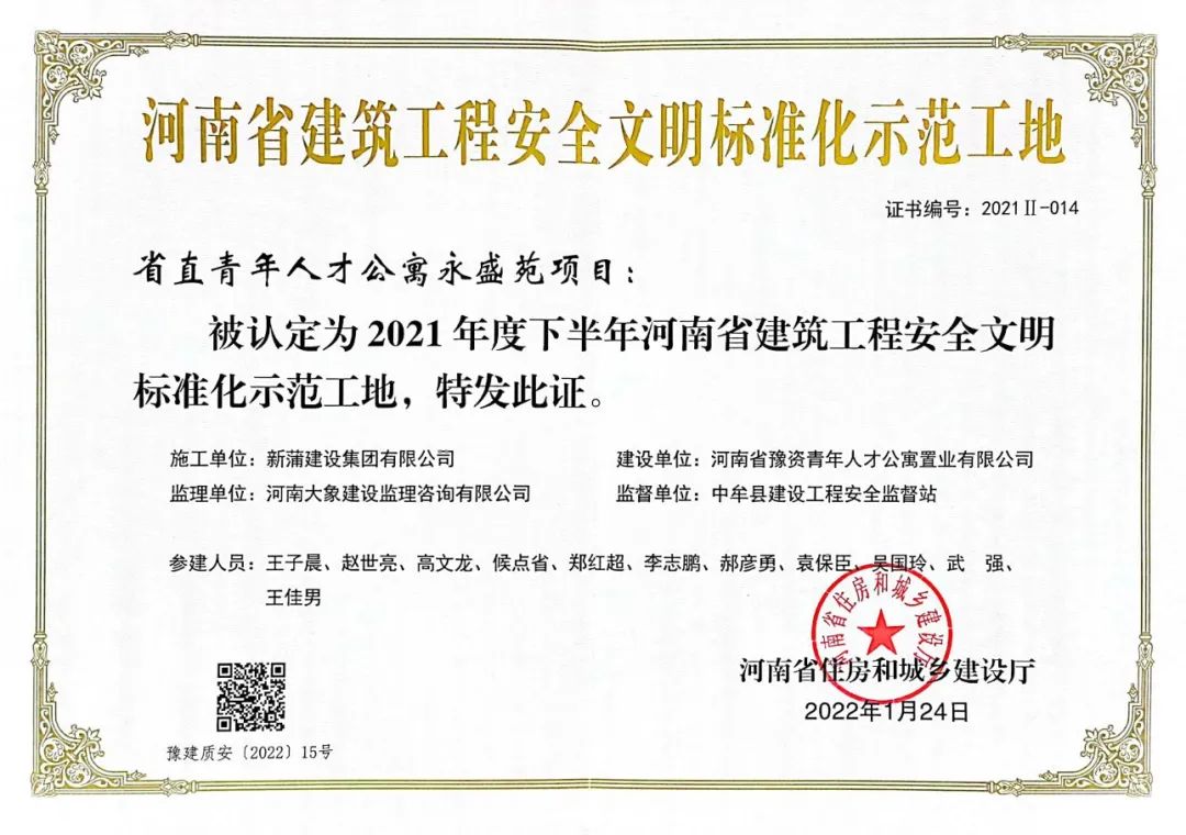 近日,由河南省住房和城乡建设厅组织评审的2021年度下半年河南省建筑工程安全文明标准化示范工地结果公布,新蒲建设集团有限公司建设的省直青年人才公寓永盛苑项目、郑州市青年人才公寓沁河苑1号楼项目获得了“河南省建筑工程安全文明标准化示范工地”的荣誉称号。