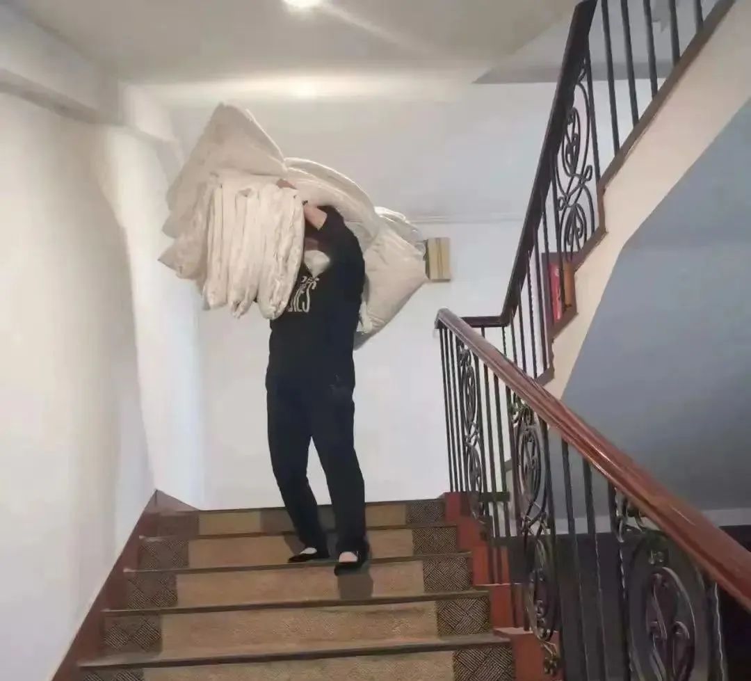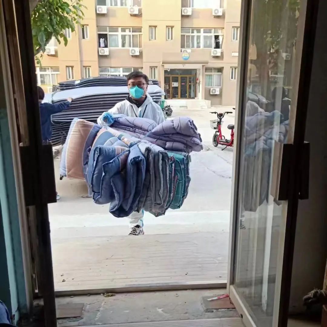 公寓服务中心副经理张佳清和园区主任从白天忙到黑夜,仅凭二人之力给东苑园区送值守保障物资,包括被子,床垫,折叠床等等,为让工作人员在劳累的工作后能够得到充足的休息。
