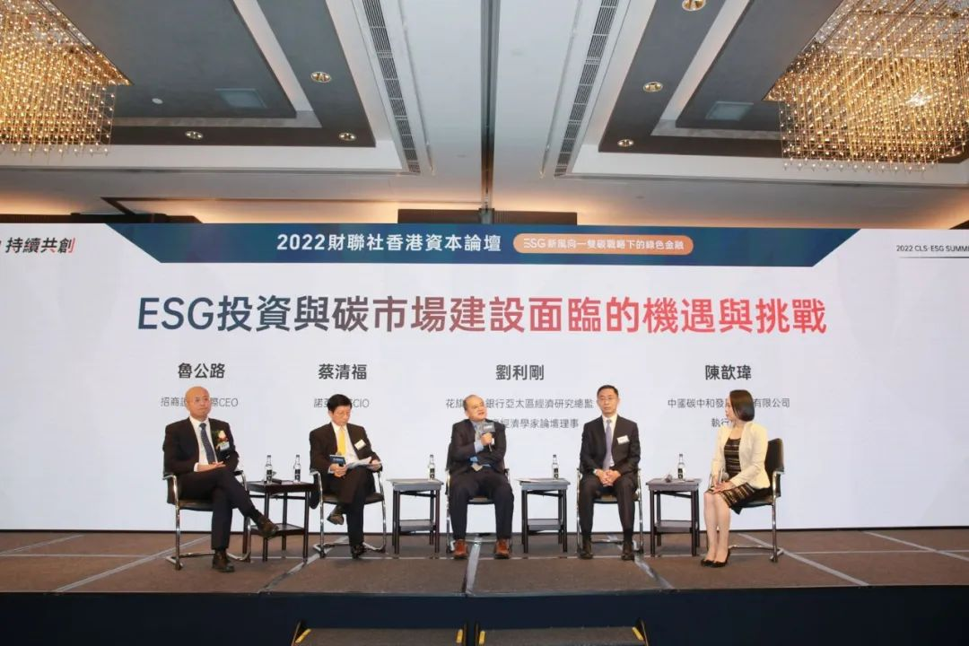 在名为“ESG投资与碳市场建设面临的机遇与挑战”圆桌对话中,蔡清福先生同招商证券国际CEO鲁公路、花旗私人银行亚太区经济研究总监、中国首席经济学家论坛理事刘利刚、中国碳中和发展集团有限公司执行总裁陈歆玮、穆迪ESG业务拓展副总监何袆文等嘉宾一起进行了深入探讨。