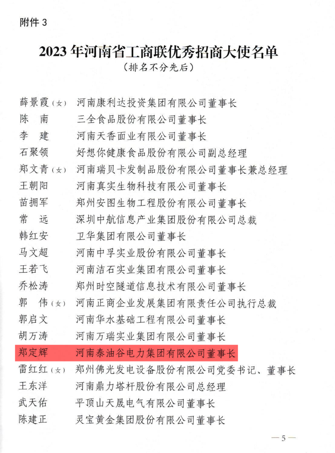 2024年1月11日,河南省工商联印发了《关于表扬2023年度全省工商联系统经济服务等工作先进单位和先进个人的决定》(豫联发〔2024〕5号),其中,省侨商会常务副会长、河南泰油谷电力集团有限公司董事长郑定辉为“2023年河南省工商联优秀招商大使”。