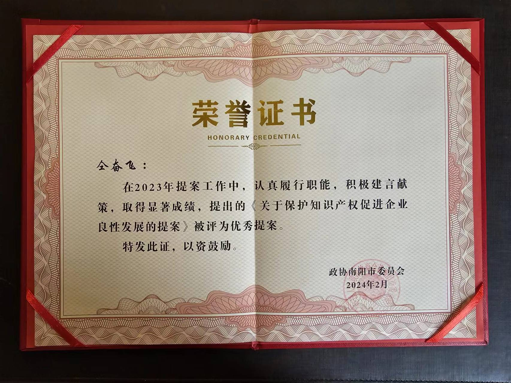 作为政协委员,仝奋飞博士为了南阳的发展积极建言献策,做出了具体努力和贡献,并被评为2023年度优秀政协委员。
