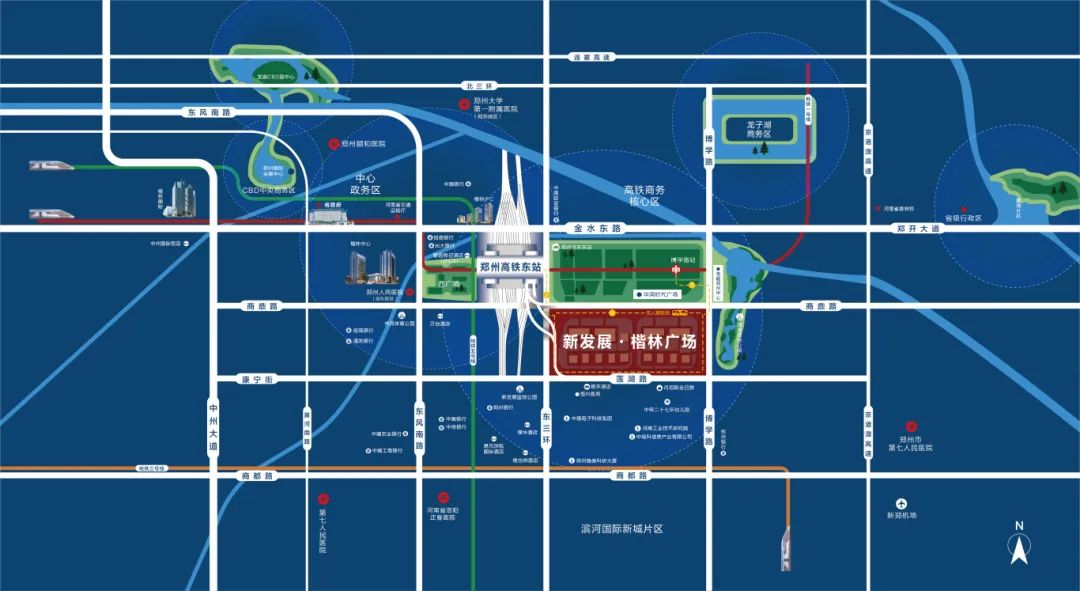 立于全国米字型高铁枢纽站,立足中原面向世界的门户,立序中原高铁东站CBD压轴地,新发展楷林智慧广场落子郑州东站东广场。作为郑州2035年战略留白地——高铁东广场,由政府投资48亿元,打造地下综合交通管理系统,布局18个重点项目,总投资超2400亿。随着中原超级总部基地规划落地开拔,必将迎来城市商务资产的新腾飞。