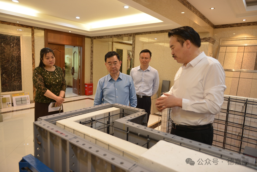 在调研过程中,李明献带领调研组各位领导,对德嘉丽集团NBW建筑结构保温一体化体系、内外墙建筑涂料、内外墙装饰板材等展品进行了参观,并向各位领导表达了德嘉丽集团始终坚持发展绿色建材的理念,来访领导们给予了高度评价。