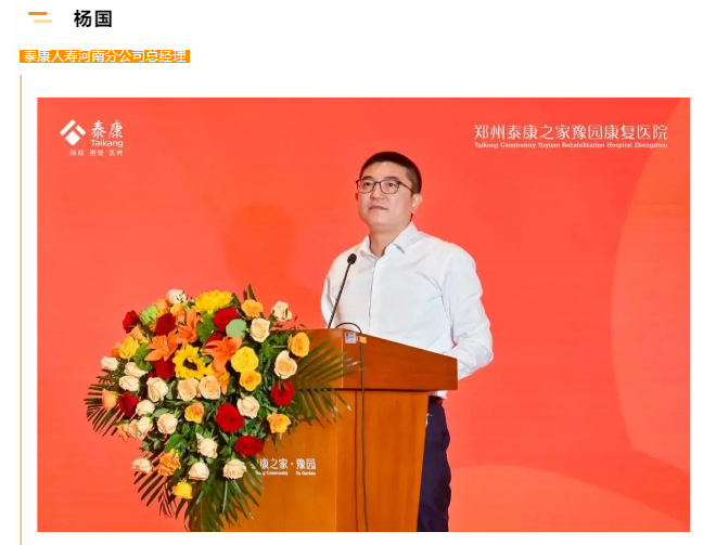 泰康人寿河南分公司总经理杨国在致辞时表示,豫园康复医院的盛大开业进一步丰富了泰康保险集团在豫的大健康生态,未来,支付端将坚定与服务端做好联动,借助康复医院多样化的健康超体活动,为客户提供更加优质的健康管理服务。