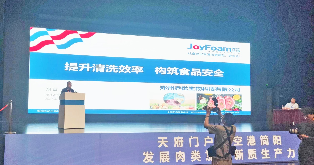 郑州乔优生物科技有限公司副总经理刘益,在大会发表了《提升清洗效率,构筑食品安全》的主题报告。报告分析了当今食品加工行业的食品安全风险来源,其中由于清洁卫生不到位引起的占比较大。传统的清洗方式难以适应现代化食品加工行业的需要,清洗效率低下是导致清洁卫生问题的主要因素。