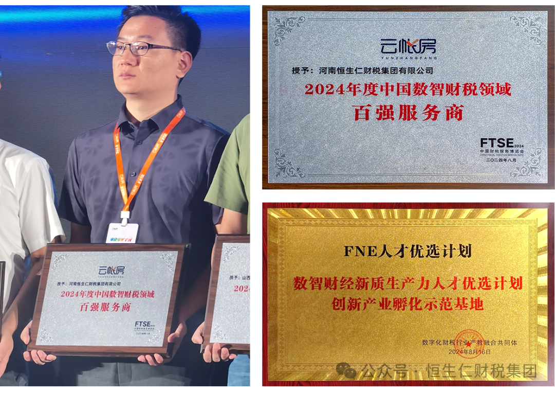 本次中国财税服务博览会上恒生仁财税集团凭借卓越的专业能力和创新的服务模式,荣获“全国财税百强服务商”以及“数智财经人才示范基地”荣誉。
