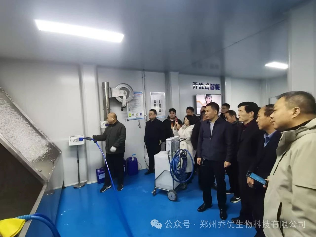 在万总带领下,协会领导参观了公司文化长廊、加工车间、产品体验中心等。在乔优公司产品体验中心,领导们仔细了解清洗消毒系列化产品、智能化清洗消毒设备、作业流程,并认真观看了泡沫清洗现场演示操作等。