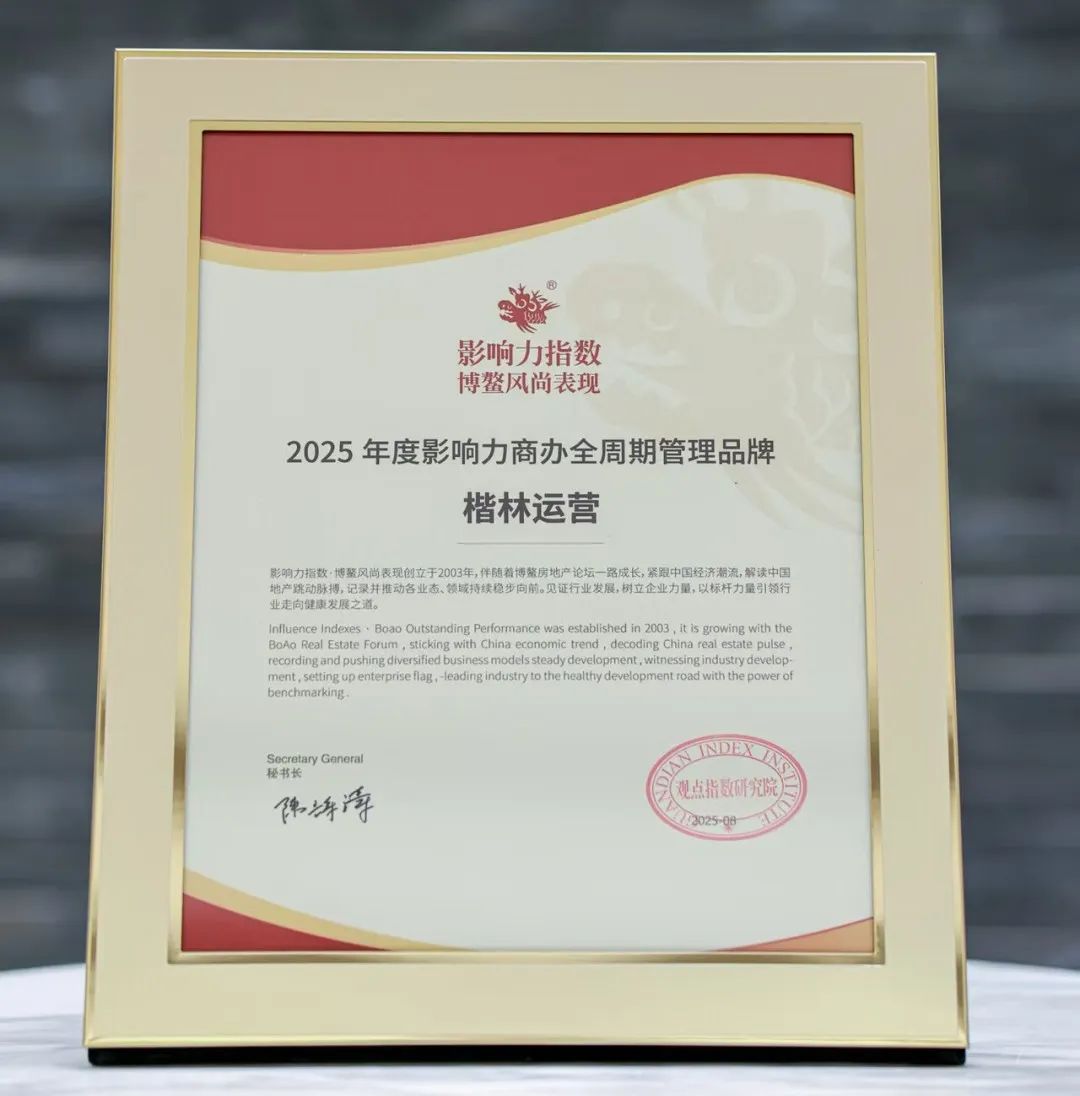 8月13日,海南博鳌。在汇聚全球产业链精英的 2025博鳌房地产论坛风尚盛典 上,河南省侨商联合会常务副会长单位楷林控股旗下楷林运营从千家企业中脱颖而出,荣膺 “影响力指数·2025年度影响力商办全周期管理品牌” 。这份由中国权威研究机构 观点指数研究院 颁发的殊荣,不仅是对楷林24年深耕商办领域的实力认证,更是中国实体经济韧性发展的时代注脚。