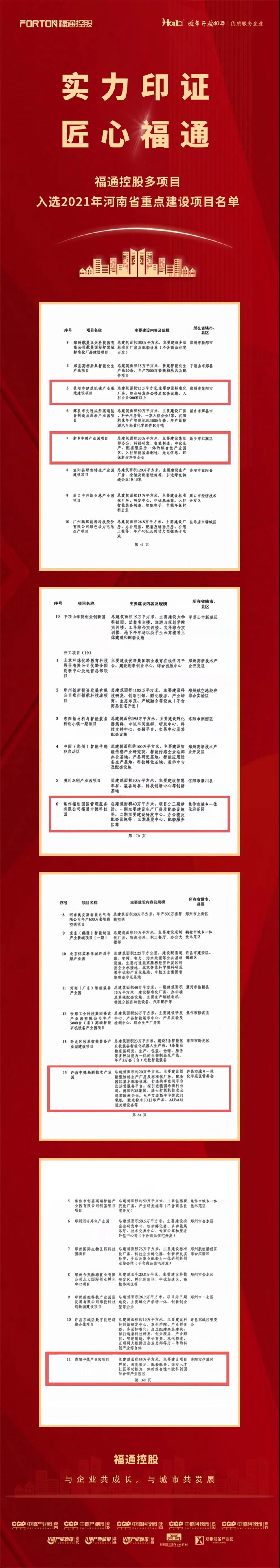 这其中不乏多次入选的项目,如:新乡中德、洛阳中德和郑州装备产业园;也有后续发力首次入选的项目:许昌中德、焦作中德。至此,福通控股集团旗下已有10个项目获得“河南省重点项目”殊荣。