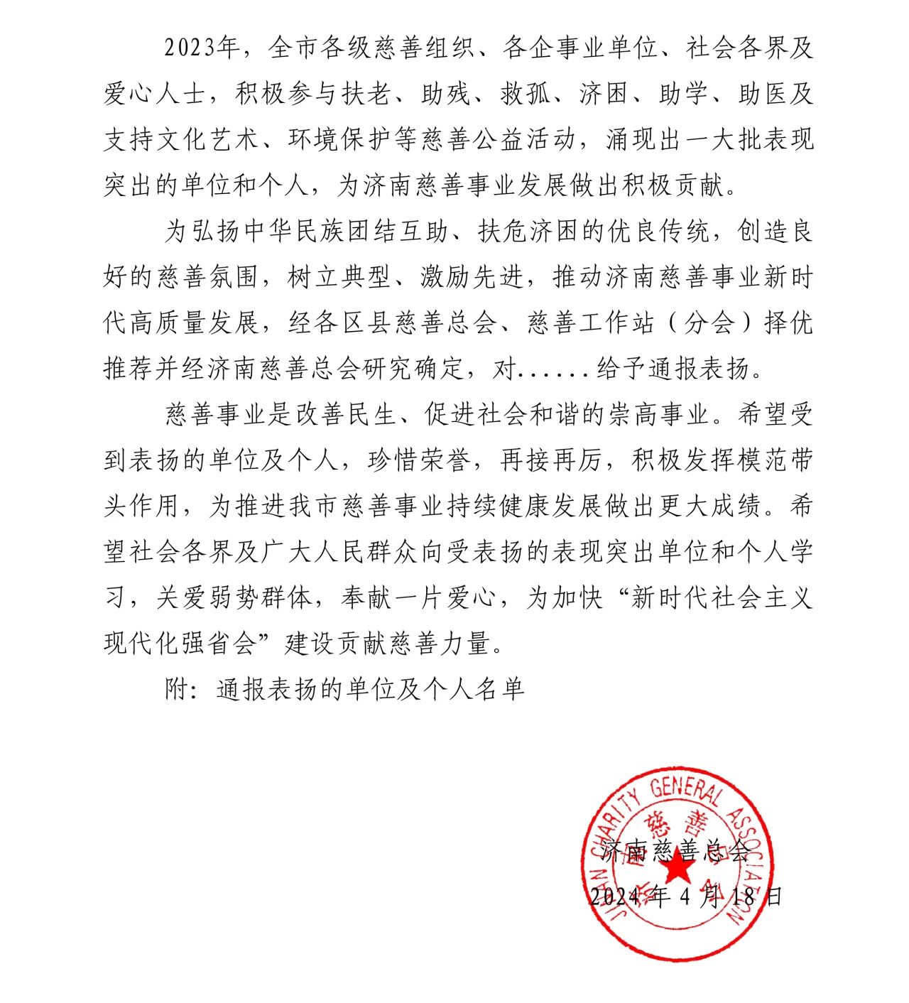 近日,为弘扬中华民族团结互助、扶危济困的优良传统,推动济南慈善事业新时代高质量发展,济南慈善总会专门下发表彰通报,表扬了济南市2023年度慈善工作表现突出典型。省侨商会名誉会长单位德迈国际产业集团被表彰为2023年度爱心捐赠单位。