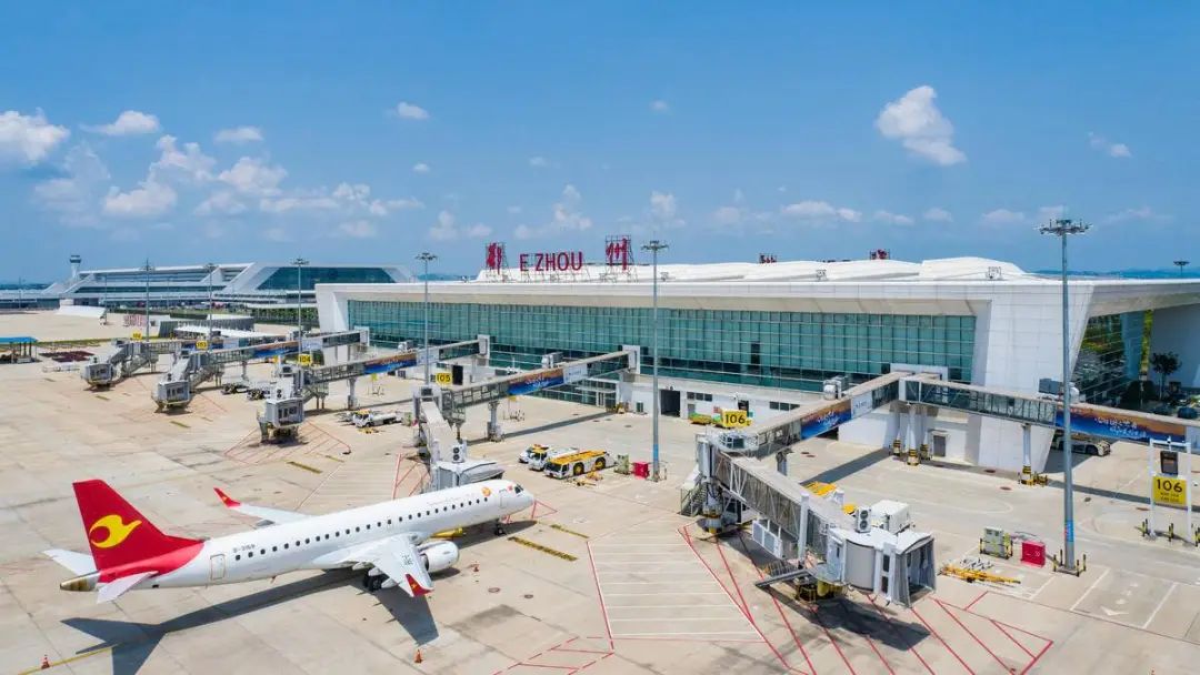 一架天津航空的民航客机停靠在鄂州花湖机场航站楼。(湖北日报全媒记者 任勇 通讯员 王星予 摄)
