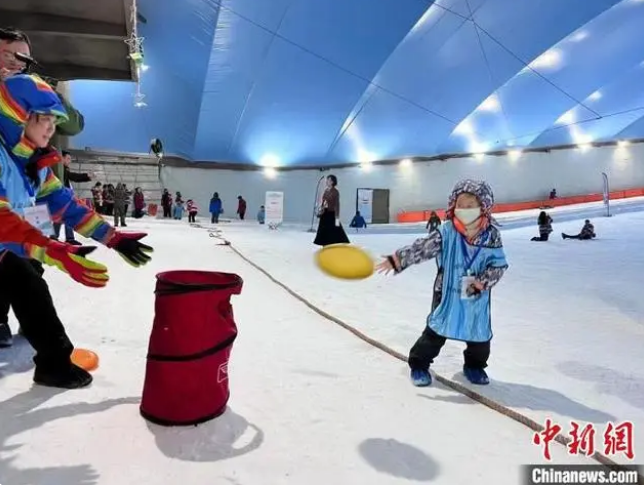 除了冰雪运动,目前都风靡盛行的飞盘运动也在滑雪场上演。场内,雪地飞盘投掷赛同时进行,每组参赛选手领取10个飞盘,努力扔进框内。飞盘与冰雪的结合,为喜欢飞盘、热爱冰雪的青年搭建起交流的平台,激发了参赛者的运动热情。