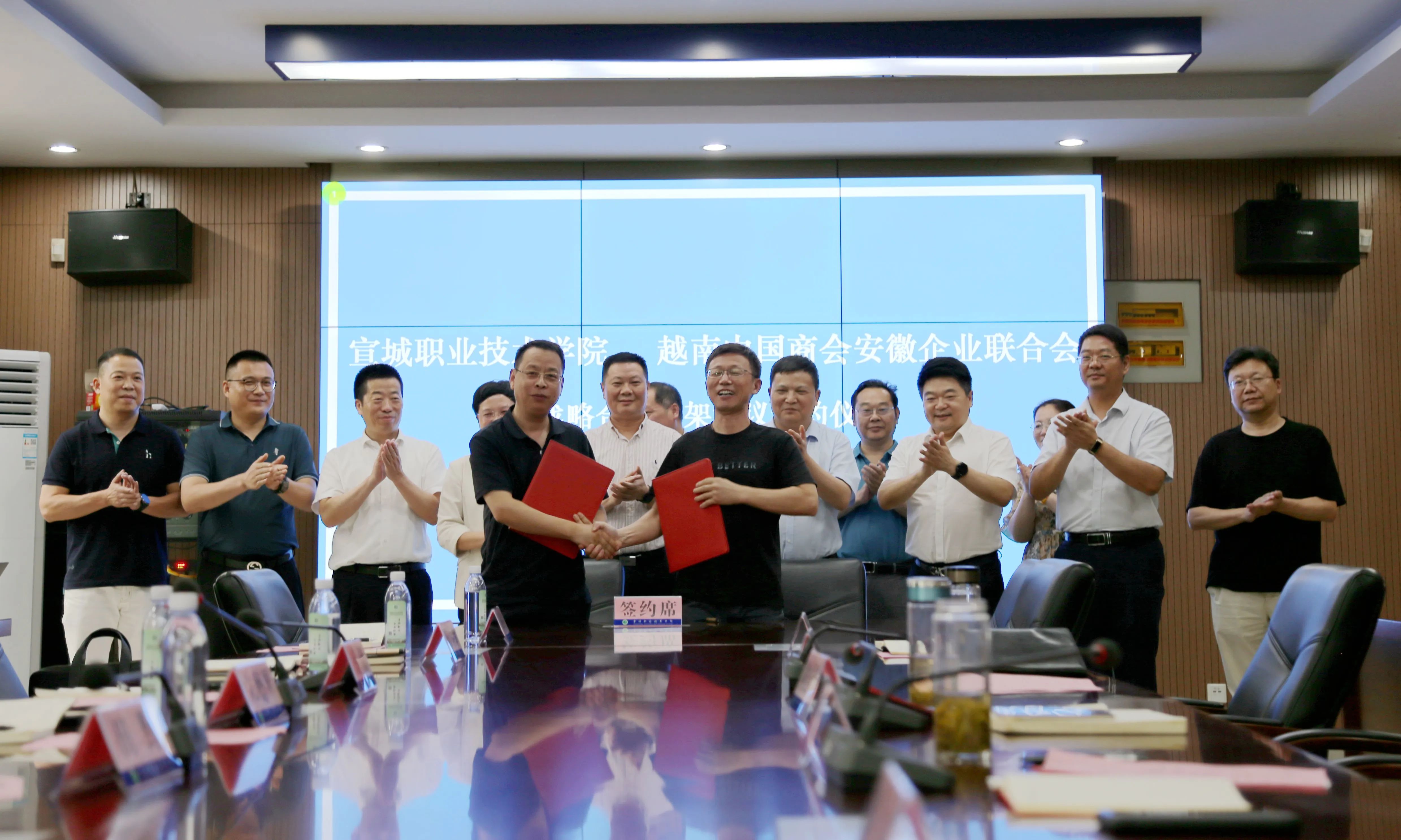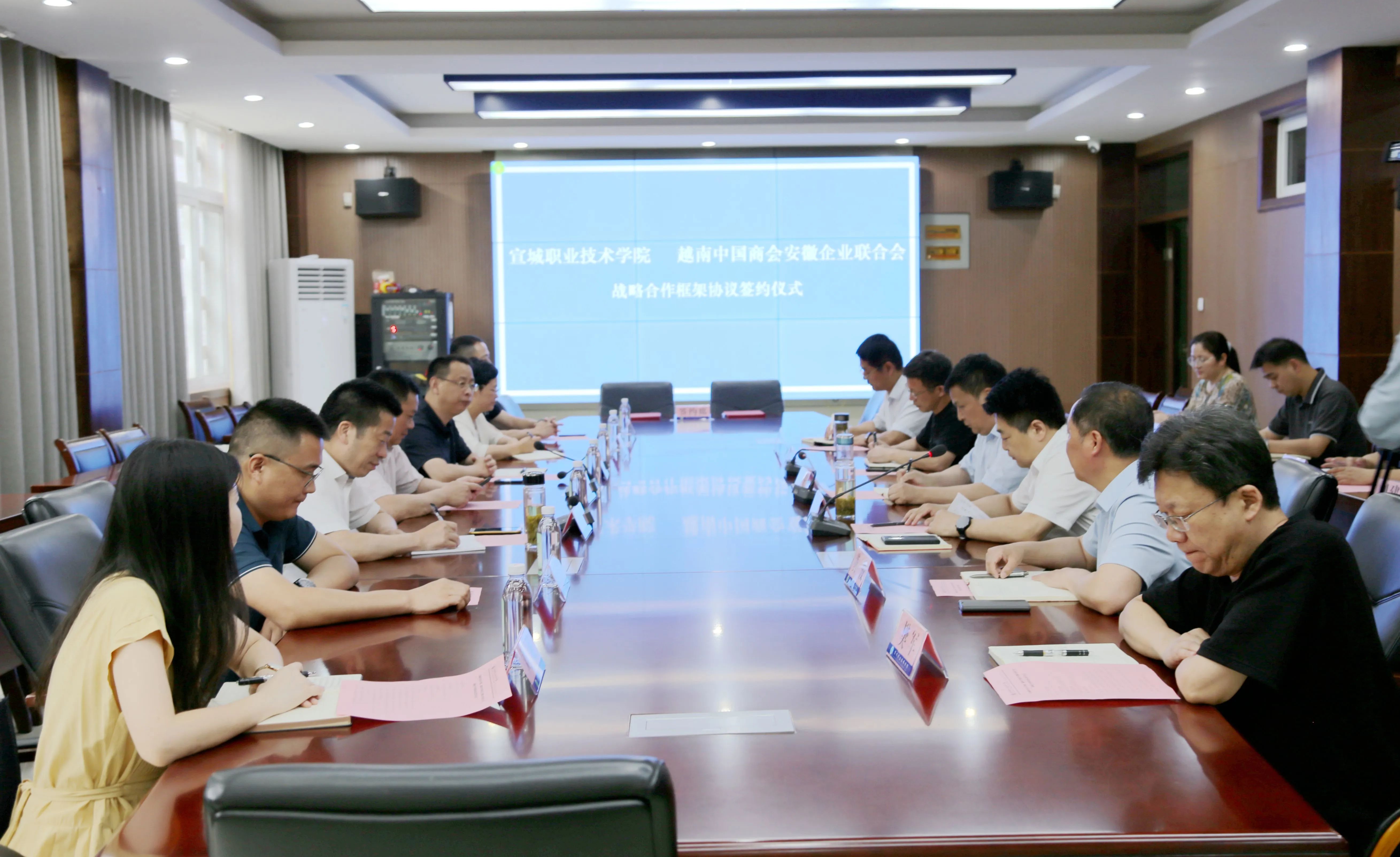 6月16日,越南安徽商会与宣城职业技术学院举行战略合作框架协议签约仪式。安徽省侨联经济科技部部长宋德琴,学院院长陶庭先,越南安徽商会执行秘书长盛锴,中国国际贸易促进委员会宣城市委员会主任田野,市委统战部副部长陈春娣,学院党委副书记庞波、副院长范春申出席签约仪式。签约仪式由庞波主持。