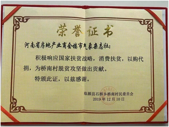 河南省房地产业商会楼市气象杂志社等因积极响应国家扶贫战略,消费扶贫,以购代捐,受到表彰。