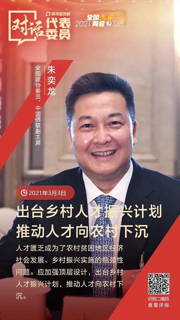 “今年年初电视剧《山海情》的热播,展示了我国贫困地区广大干部群众艰苦奋斗的精神,体现了既要扶‘智’也要扶‘志’的宝贵扶贫经验。但目前农村劳动力缺乏、人才匮乏的窘境还没有得到有效解决。”在今年的全国两会中,全国政协委员、中国侨联副主席、中国侨商联合会常务副会长朱奕龙提交了关于推进乡村人才振兴的建议。