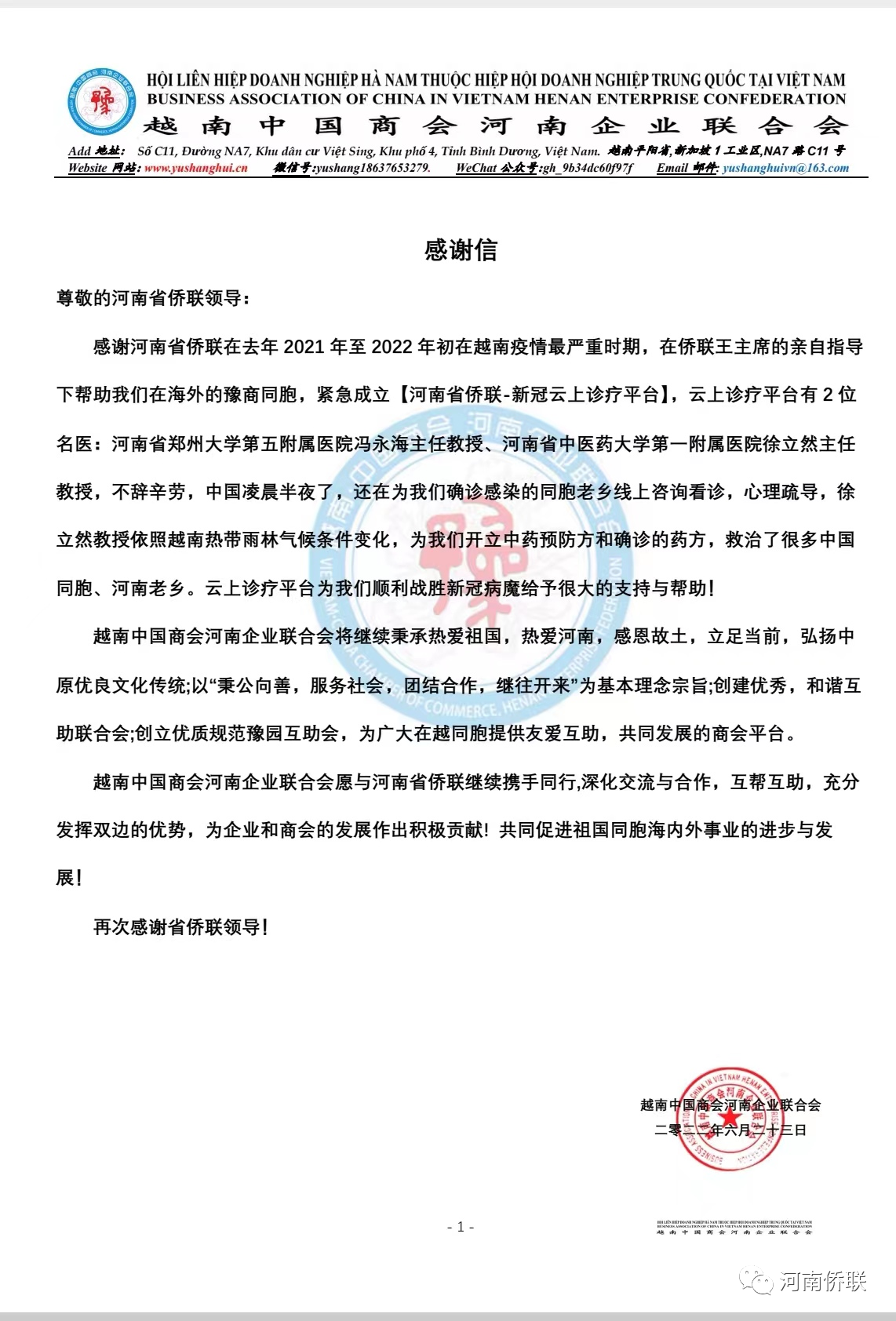 朱学锋带来了越南中国商会河南企业联合会的感谢信,信中对河南省侨联成立“云上诊疗平台”助力越南海外同胞战胜新冠病魔表达了诚挚谢意,表示将充分发挥自身优势,进一步加强与河南省侨联的交流与合作,为河南经济发展和现代化建设贡献绵薄之力。吴英豪就香港疫情和商会的发展做了简要介绍,表示将继续做好香港豫籍同胞的团结引导工作,全力支持行政长官和特区政府依法有效施政,为维护香港社会的繁荣稳定作出积极贡献。