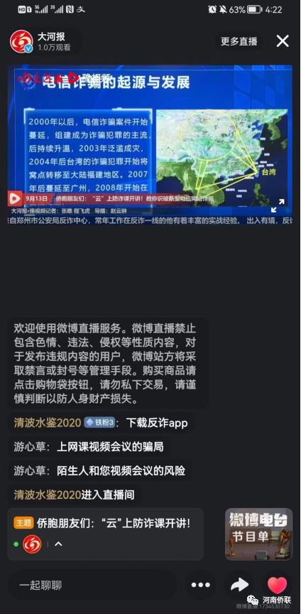 2022年9月13日,由河南省侨联主办,郑州市公安局反诈中心、省侨联权益保障部、大河报·豫视频等共同承办的首期“侨胞反诈知识大学堂”直播活动在郑举行,邀请河南省防范打击电信网络诈骗犯罪专家相冰警官作主题讲座,来自全球40余国家和地区的侨领侨胞、留学生、国内归侨侨眷,及省辖市政法、侨联等部门干部职工5万余人次在线参加此次讲座。本次活动通过“大河报·豫视频”“大河看法”“反诈第一线”等新媒体矩阵同步直播,截止日前,直播收看量已破6万人次,网友互动留言千余条。