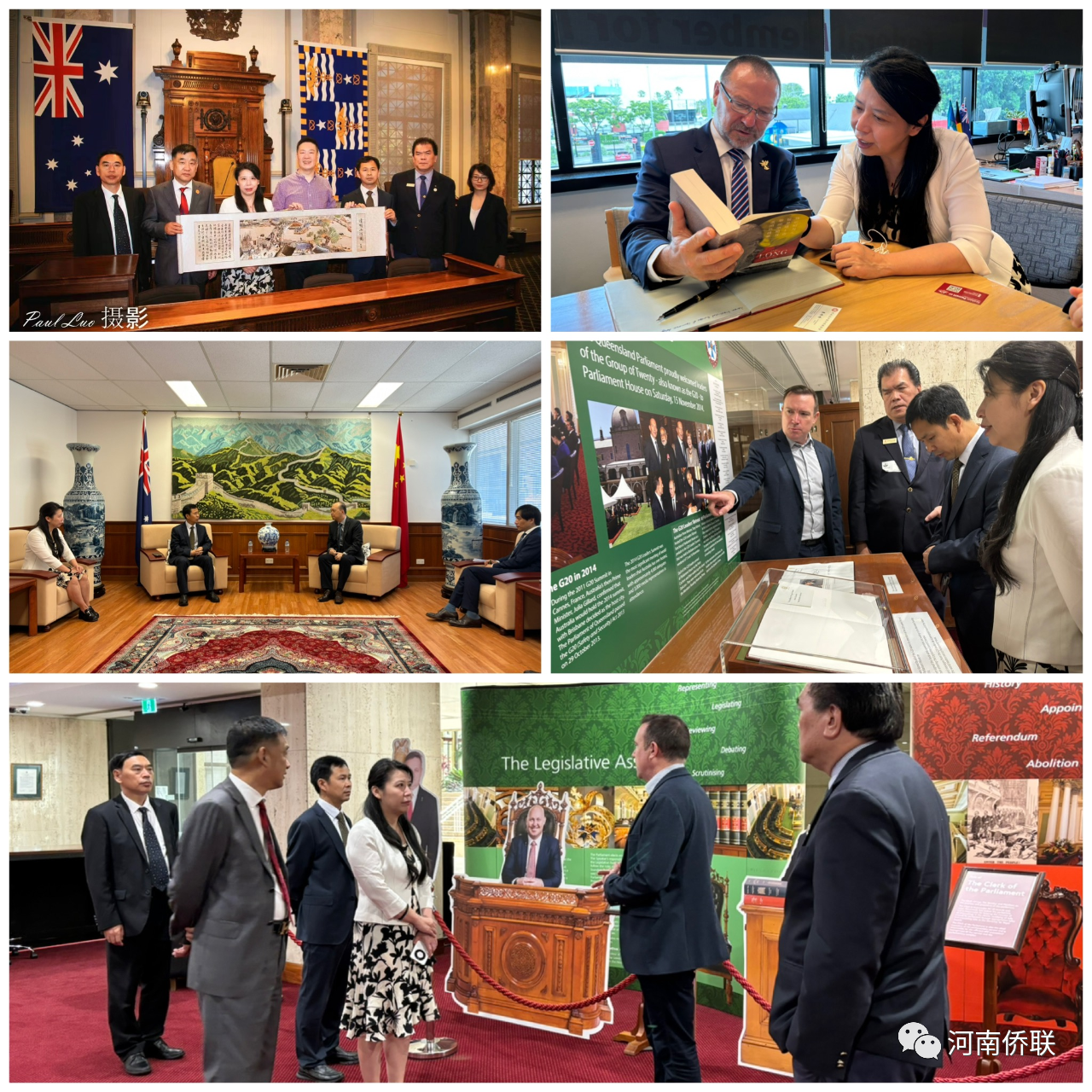 吕剑一行先后走访了昆士兰州议会、布里斯班市政厅和中国驻布里斯班总领馆,拜会了联邦议员Graham Perrett MP、州议员Peter Russo MP、James Martin MP、Corrine McMillan MP以及市议员Cr Steven Huang、澳大利亚中国工商业理事会成员Bruce Atkinson、昆士兰华人联合会会长马连泽等政要和侨领,了解了当地的政治、经济、社会和文化情况,感受到了当地的发展活力和多元包容。此外,代表团还实地考察了zoomlion machinery中联重科、斯巴达机械有限公司、喜椰、澳洲维度资本公司、宇通悉尼公司等华人华侨企业、商铺和海外河南企业,详细了解企业的发展状况和在澳洲市场的市场情况,对企业立足国内制造业优势、勇于开拓海外市场给予充分肯定。