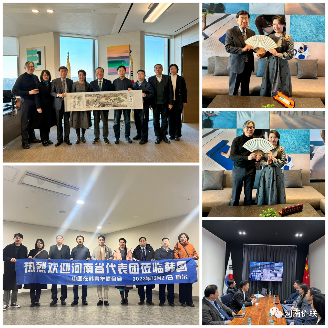 在韩国期间,吕剑一行与中国在韩青年联合会开展座谈,围绕河南与韩国之间的文化交流、经贸往来、教育合作、侨胞维权等方面进行深入交流。代表团还拜访了韩国国会前副议长郑甲润、韩国碑林园理事长许由、柳昌洙会长。吕剑表示,中韩两国地缘相近、人缘相亲、文缘相通,文化交流的历史源远流长。近年来,河南省与韩国共同开展的“亲情中华. 中原文化海外行”、中韩书画展、友城合作交流等活动受到两地民众的热烈欢迎,加深了对彼此的文化认同和情感认同。希望以此次访问为契机,与各位新老朋友携手合作,持续开展不同层次、多种形式的合作交流,为豫韩两地加强了解、凝聚友情搭建起坚实桥梁。双方互赠了具有国家特色的纪念品,象征着豫韩之间的友谊深厚、历史绵长。