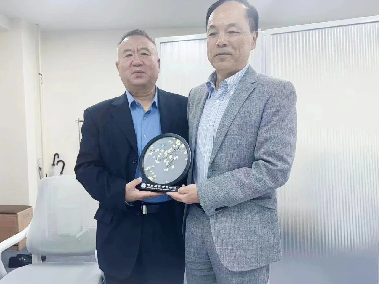 5月10日上午,罗建中、苗青、宋保山、柴莉一行到访东京JC国际株式会社,与东京JC国际株式会社社长李军座谈交流,并赠送独具河南特色的汴绣礼物。