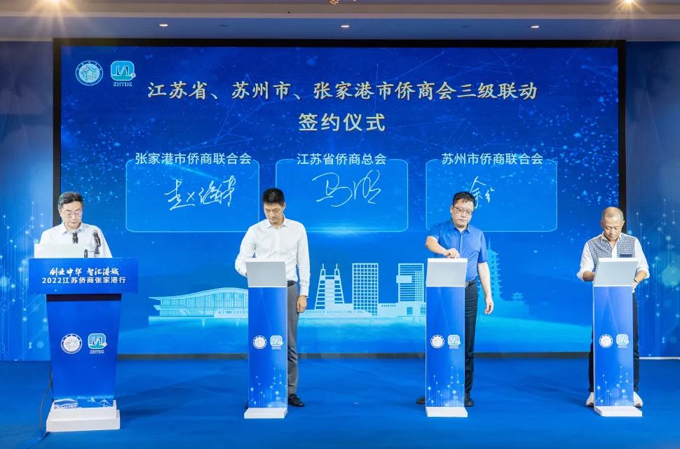 江苏省侨商总会副会长马明、苏州市侨商会秘书长余维导、张家港市侨商会会长赵海荣共同签署了省市县三级侨商会互联互通的三级联动机制合作协议。与会的三位嘉宾分别作项目路演,结束后进行项目洽谈。
