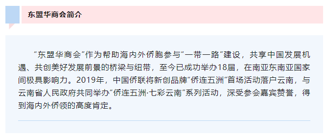 6月8日,由中国侨联和云南省政府共同主办,云南省侨联、云南省商务厅、云南省投促局、致公党云南省委员会联合承办的“侨连五洲·七彩云南——第19届东盟华商会”在昆明隆重开幕。中国侨联党组书记、主席万立骏,云南省委常委、省委统战部部长、省委教育工委书记杨宁出席开幕式并致辞,云南省人民政府副省长王浩主持开幕式。