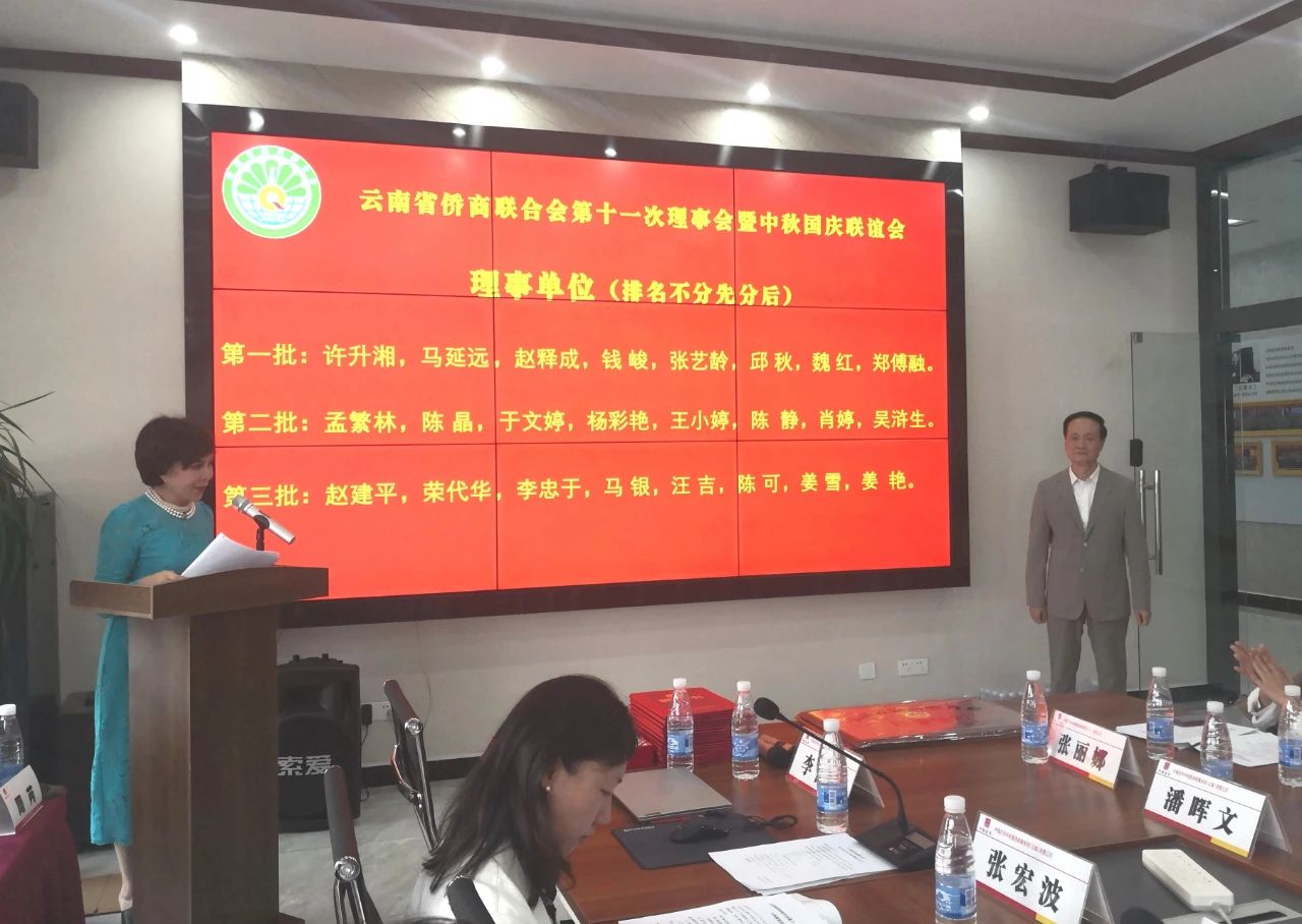 9月10日、八月初八,在喜迎中秋、国庆“双节”前夕,云南省侨商联合会在监事长赵雪松单位 —中瑞岳华中旺税务师集团云南公司圆满举行第十一次理事会暨联谊活动。云南省侨联副主席万妍娟女士莅会指导并致辞,经科部干部陈绍虎参会交流。云南省侨商联合会尹元江会长作第二季度以来工作报告,常务副会长、云南天城集团总经理张晓丽主持。百席座位座无虚席,在参会占比理事会成员总数84%的热烈氛围中,一个小时完成所有议题圆满结束。
