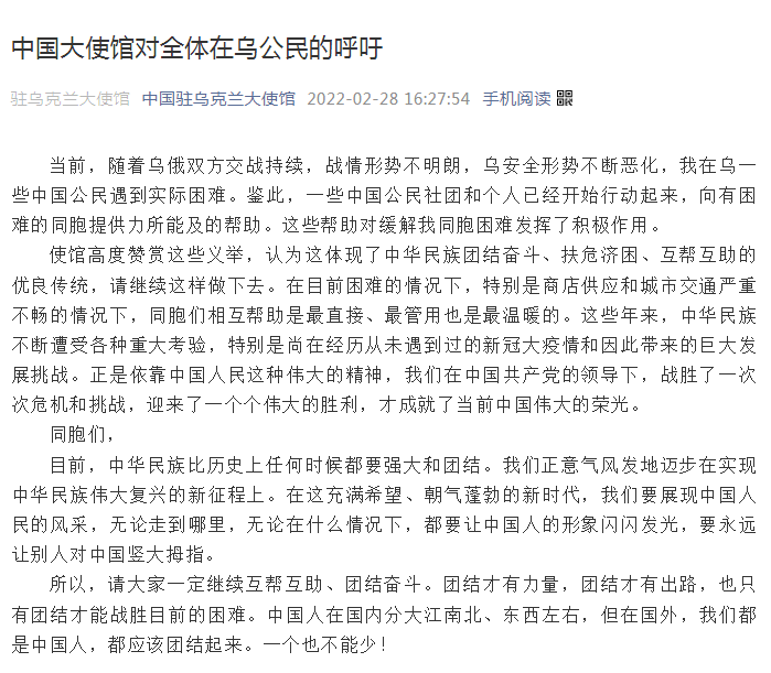 2月28日,驻乌克兰大使馆对全体在乌中国公民发出呼吁。使馆表示,当前,随着乌俄双方交战持续,战情形势不明朗,乌克兰的安全形势不断恶化,一些在乌中国公民遇到了实际困难。鉴此,一些中国公民社团和个人已经开始行动起来,向有困难的同胞提供力所能及的帮助。这些帮助对缓解同胞的困难发挥了积极作用。