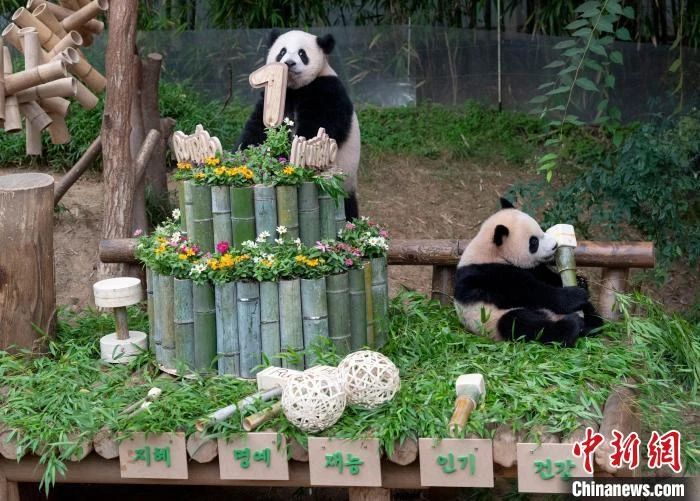 ■ 在韩国诞生的大熊猫双胞胎“睿宝”和“辉宝”7日迎来一周岁生日。爱宝乐园当天为它们举办庆生活动。抓周仪式是活动的一大看点。“睿宝”最终抓下象征健康的杠铃,“辉宝”抓下象征人气的麦克风。